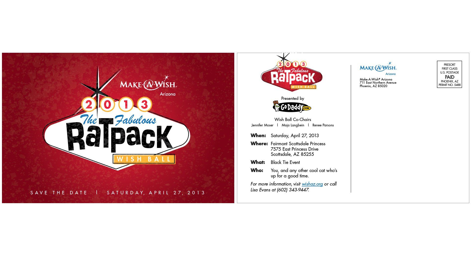 Save-the-date mailer for the Vegas-themed 2013 Make-A-Wish fundraiser gala event, 8.5" x 5.5"
